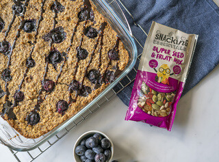 In a large bowl mix oats with Snacking Essentials Super Seed and Fruit Mix, cinnamon, nutmeg, ginger, baking powder and salt.